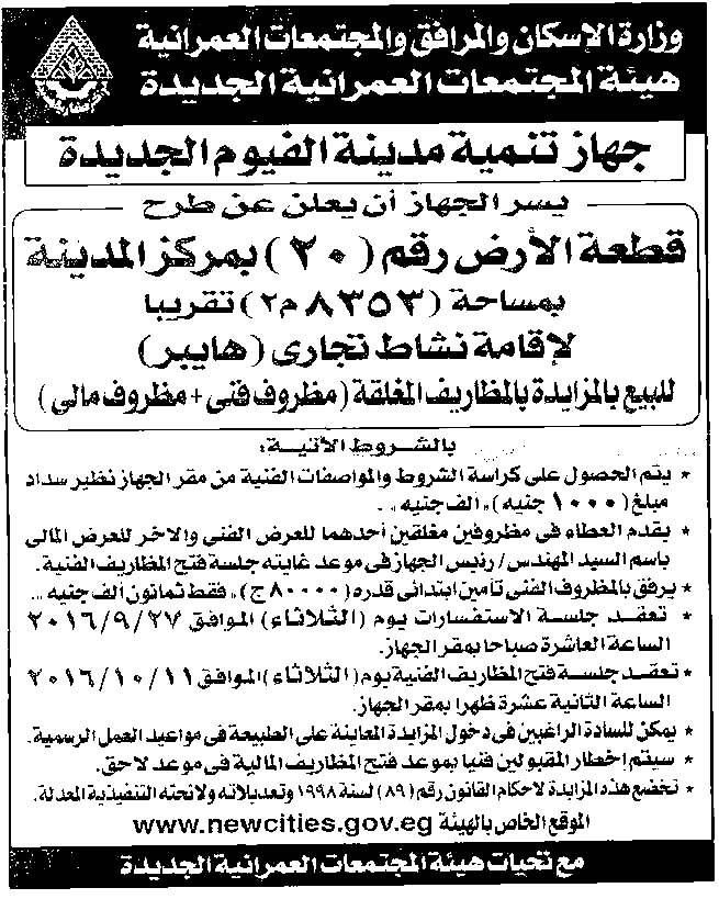 يبدا الاحد المقبل 7 8 2016 فتح سحب كراسات التقدم لشراء قطعة ارض بالمدن الجديدة.