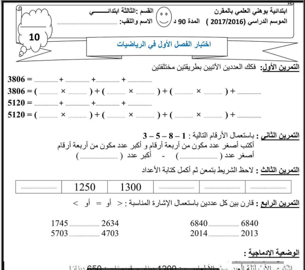 اختبارات في مادة الرياضيات للسنة الرابعة ابتدائي الجيل الثاني للفصل الاول 2017 2018 Math Chapter One Exam