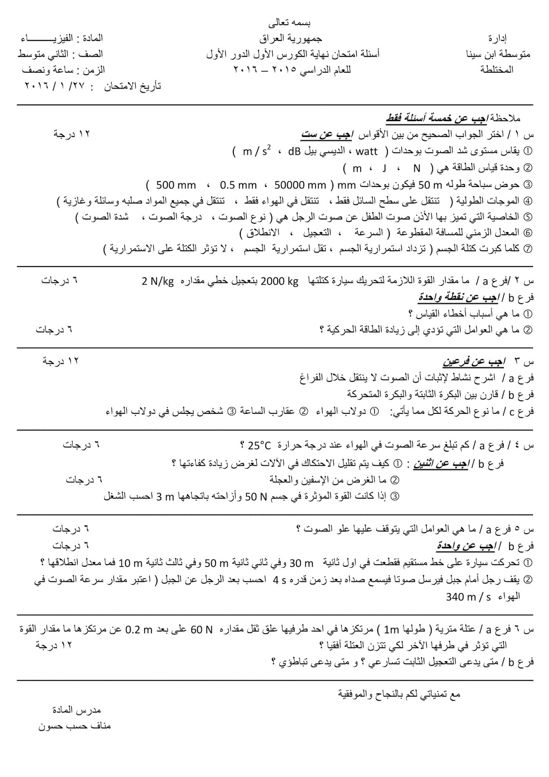 المدرس مناف حسب مجموعة من اسئلة الامتحان النهائي لمادة الفيزياء للصف الثاني المتوسط