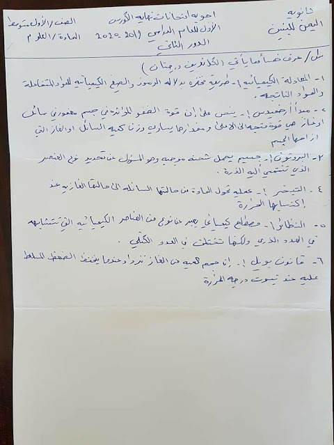اسئلة علوم اول متوسط مع الاجوبة دور ثاني نصف السنة نهاية الكورس الاول