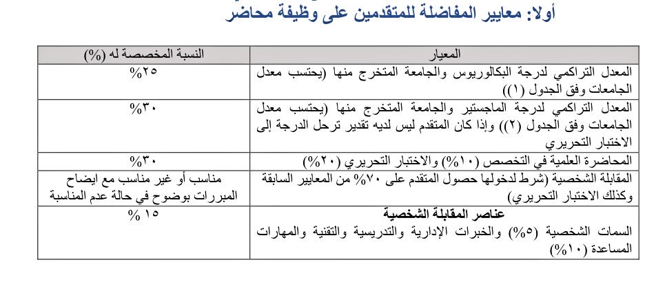 وافي بن عبد الله A Twitter معايير اختيار المعيدين والمحاضرين والمدرسين بجامعة أم القرى 60 للمعدل الدراسي 30 الاختبار التحريري على أن يجتاز 60 من درجة الامتحان 10 للمقابلة الشخصية على أن