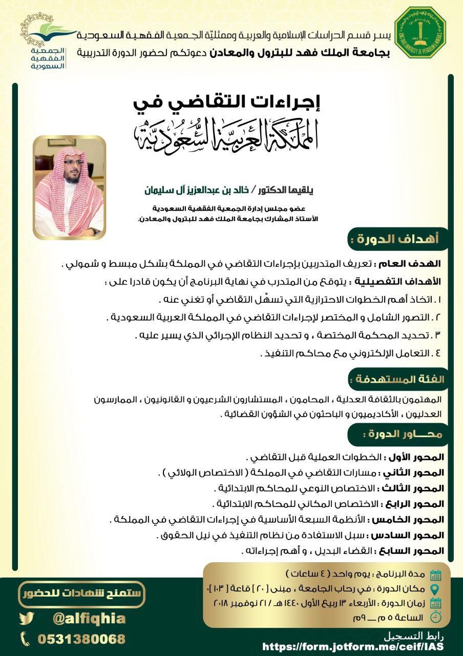 يسر ممثلية الجمعية الفقهية السعودية في جامعة الملك فهد للبترول والمعادن دعوتكم للمشاركة في الدورة التدريبية القضائية إجراءات التقاضي في المملكة العربية السعودية يقدمها د خالد بن عبدالعزيز آل سليمان الجمعية